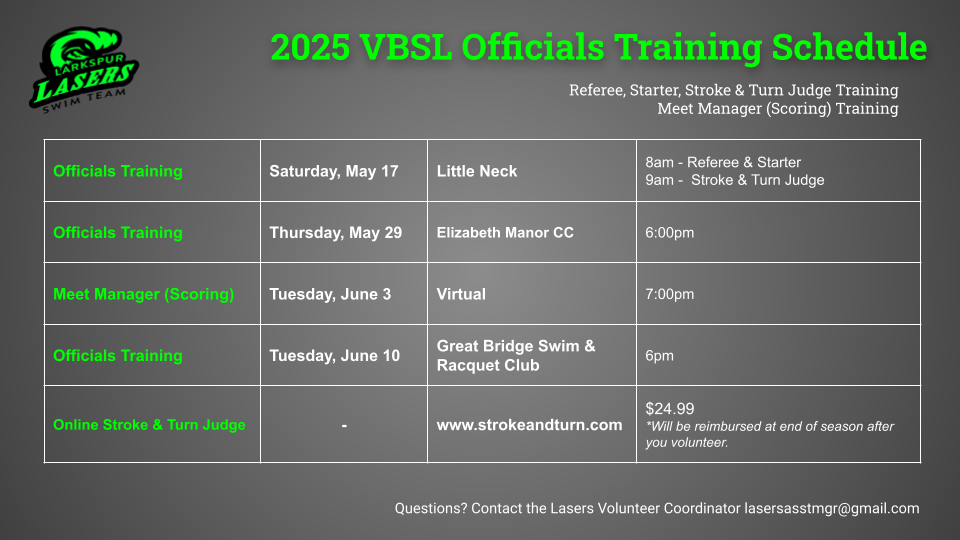 Parent volunteers are an essential part of operating a swim team. It's a great opportunity for parents to model good sportsmanship and make new friends in their community too. Larkspur requests for all families to play a role in making our team successful! Therefore, we request help for meets and other activities for the Lasers. From officials, to timers, to runners, to party planners, concessions stand, and apparel or ribbon/award distribution - there is a job for everyone!
