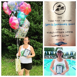 2022 VBSL’s Spirit & Sportsmanship Award was presented to the Larkspur Lasers Team Representative Stacey Raeburn at the ALL STARS meet. This award is voted on by all team representatives in the Marlin Division. Such an honor to be recognized by peers in VBSL for our team’s warm and welcoming culture. Thank you to Aquawear for the award!