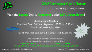 Larkspur Swim & Racquet Club's Open House is THIS SATURDAY, May 10th from 12:00-4:00. We are very excited to welcome our Lasers back after a long winter away! Aquawear will join us at 12:00 and be available until 3:00 with Team Suits and other gear. If there is rain, we will move the event indoors into the LSRC Clubhouse. This will make for tight quarters so please consider attending during your swimmer's age group window. 11&Up 12:00-1:30, 10&Under 1:30-3:00. Our Head Coach Emily Land and Team Representative Carole Fouts will...