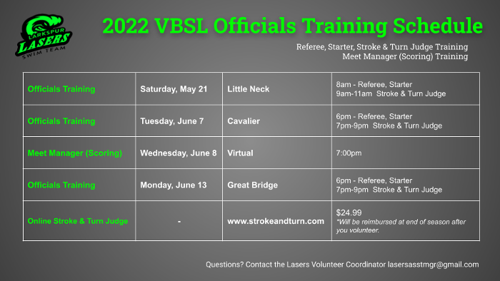 Interested in serving as an Official at our Swim Meets? Then plan to attend 1 of these trainings!