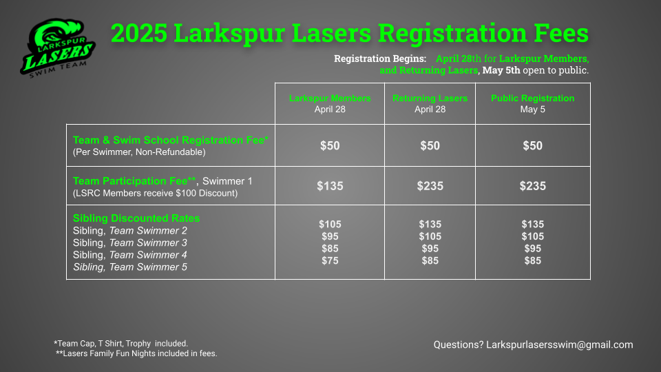 *Larkspur Swim & Racquet Club encourages but does not require club membership for swimmers to participate in the Larkspur Lasers Swim Team. LSRC Members enjoy a discount and receive early access to registration.